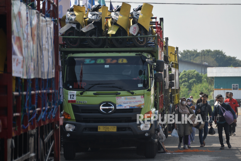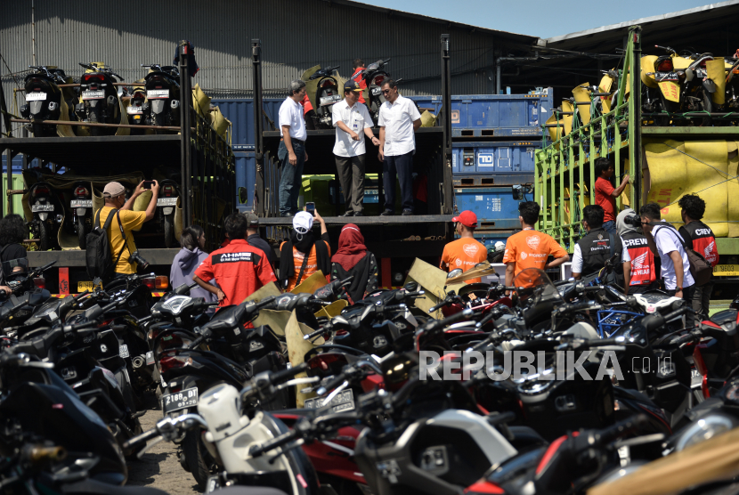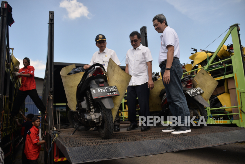 LalangBuana, JAKARTA  —  General Manager Honda Customer Care Center AHM Antok Yuniarso (kiri) bersama Direktur Angkutan Jalan Direktorat Jenderal Perhubungan Darat (Ditjen Hubdat) Suharto (tengah) dan Direktur Sarana Transportasi Jalan Ditjen Hubdat Danto Restyawan (kanan) melakukan pengecekan sepeda motor yang akan diberangkatkan dengan truk di pelataran parkir Bhanda Ghara Reksa (BGR), Kelapa Gading, Jakarta, Senin (17/4/2023).