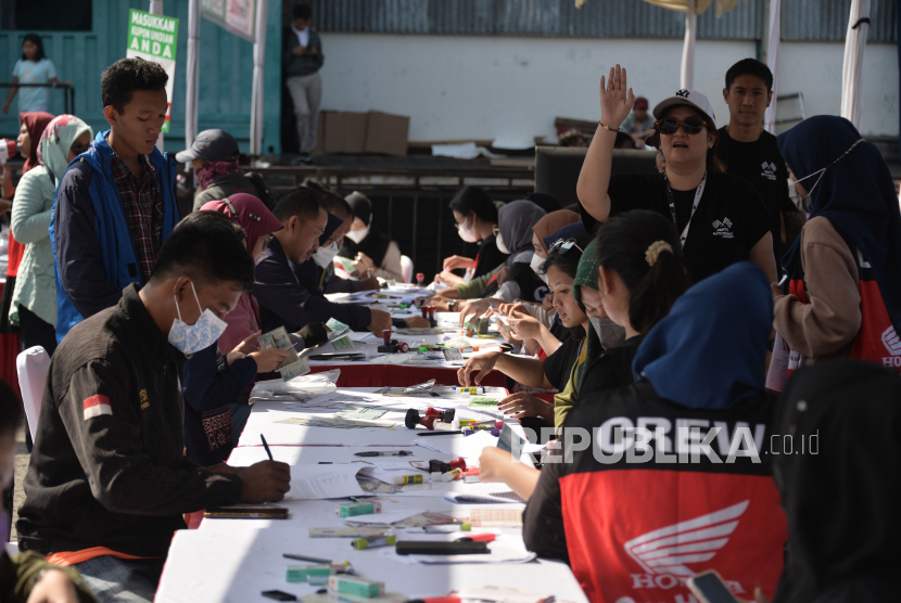 Pemudik melakukan registrasi untuk mengikuti program Mudik Balik Bareng Honda di pelataran parkir Bhanda Ghara Reksa (BGR), Kelapa Gading, Jakarta, Senin (17/4/2023). (FOTO : Republika/Edwin Dwi Putranto)
