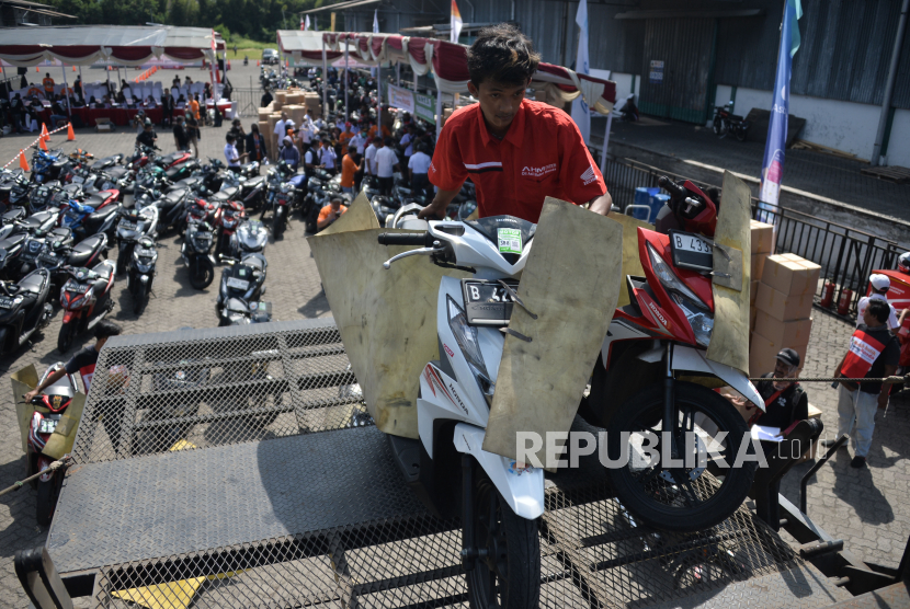 Petugas menata sepeda motor milik pemudik yang mengikuti program Mudik Balik Bareng Honda di pelataran parkir Bhanda Ghara Reksa (BGR), Kelapa Gading, Jakarta, Senin (17/4/2023). (FOTO : Republika/Edwin Dwi Putranto)