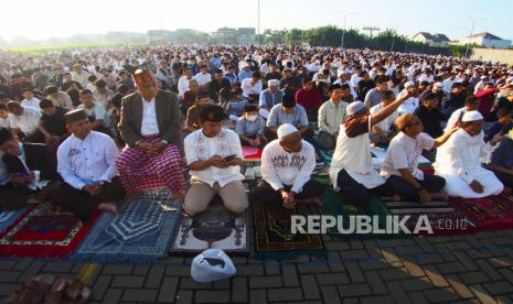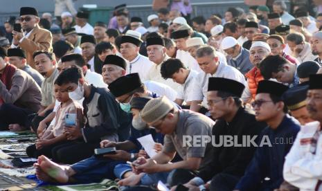 Jamaah shalat Idul Adha yang mendengarkan khutbah pada shalat Idul Adha yang digelar Pimpinan Cabang PP Muhammadiyah Kecamatan Bojongsoang, Kabupaten Bandung, Rabu (28/6/2023). Bersama ribuan warga Muhammadiyah dan warga sekitar melaksanakan shalat id di lahan parkir Transmart Buah Batu, Bandung. (FOTO : Republika/Yogi Ardhi)
