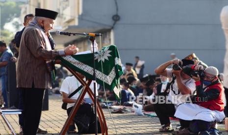 Mantan Ketua Umum PP Muhammadiyah Amien Rais memyampaikan khutbah pada shalat Idul Adha yang digelar Pimpinan Cabang PP Muhammadiyah Kecamatan Bojongsoang, Kabupaten Bandung, Rabu (28/6/2023). Bersama ribuan warga Muhammadiyah dan warga sekitar melaksanakan shalat id di lahan parkir Transmart Buah Batu, Bandung. (FOTO : Republika/Yogi Ardhi)