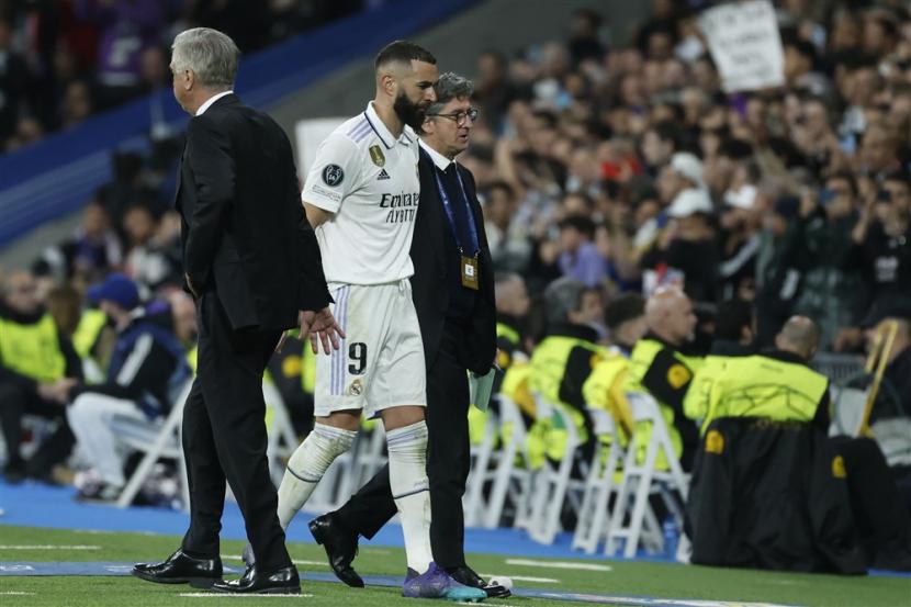 Penyerang Real Madrid Karim Benzema saat ditarik keluar lapangan dalam pertandingan 16 besar Liga Champions kontra Liverpool di Santiago Bernabeu.