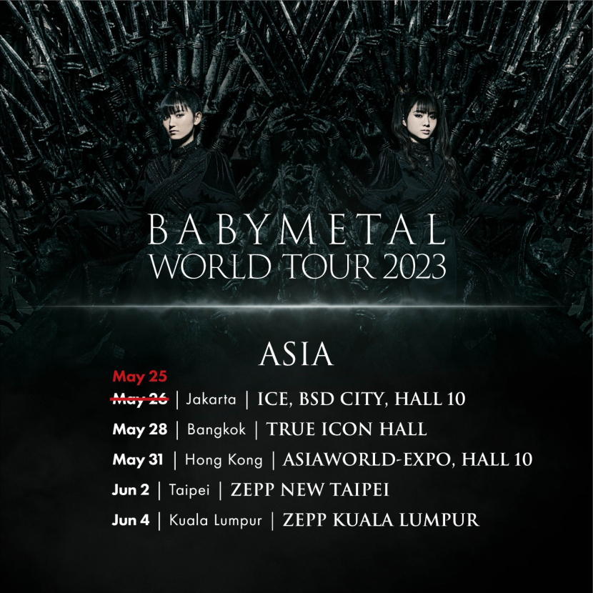 BABYMETAL akan membuka konser di Jakarta, kemudian ke Bangkok pada 28 Mei, mereka kemudian lanjut ke Hong Kong pada 31 Mei, Taipei pada 2 Juni, dan Kuala Lumpur pada 4 Juni. Sementara di Australia, Babymetal akan ke Brisbane pada 8 Juni, Sydney pada 9 Juni, dan Melbourne pada 11 Juni.