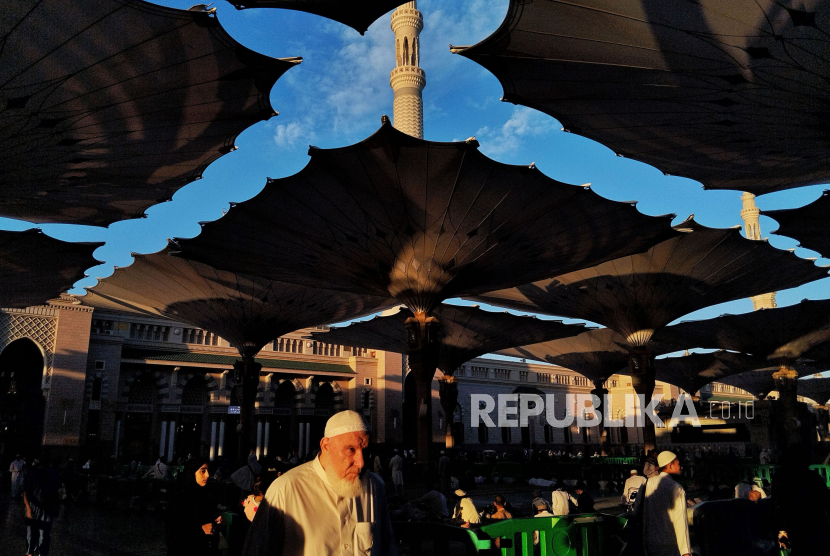 Suasana pagi hari di Masjid Nabawi, Madinah, Arab Saudi, Selasa(2/5/2023). Masjid Nabawi adalah masjid suci umat Islam selain Masjidil Haram. Usai shalat subuh langit gelap perlahan berubah menjadi terang dengan rona jingga memancar dengan Indahnya menyorot langsung ke marmer. Moment dimana matahari mulai terbit ini menambah keindahan suasana di teras masjid. Menikmati Masjid Nabawi di pagi hari adalah momen yang tidak boleh dilewatkan jamaah umroh.