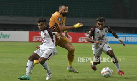 Pesepak bola Bhayangkara Presisi Indonesia Fc Mati Mier (tengah) dihadang dua pesepak bola PSM Makassar Yakob Sayuri (kanan) dan Yance Sayuri (kiri) dalam pertandingan Liga 1 di Stadion Patriot Chandrabhaga, Bekasi, Jawa Barat, Sabtu (29/7/2023). (FOTO : ANTARA FOTO/ Fakhri Hermansyah)