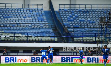 Tim Persib merayakan gol penyeimbang di gawang Madura United dengan latar tribun kosong pada laga BRI Liga 1 Indonesia di Stadion GBLA, Bandung, Ahad (2/6/2023). (FOTO : Yogi Ardhi)