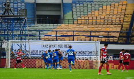 Tim Persib merayakan gol dengan latar tribun utara yang ditinggalkan penonton di Stadion GBLA pada laga Persib melawan Madura United, Ahad (2/7/2023). (FOTO : Republika/Yogi Ardhi)