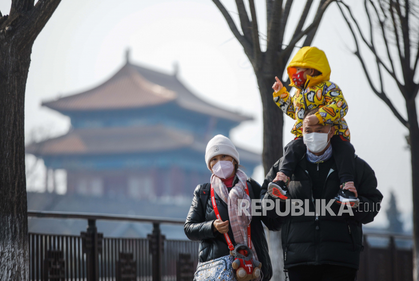 Tourists wearing face masks walk near the Turret of the Palace Museum in Beijing, China, 22 February 2023. Cina menjadi semakin berambisi dengan target pertumbuhan 2023.