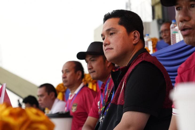 Ketua Umum PSSI Erick Thohir menyaksikan secara langsung pertandingan babak semifinal Timnas Indonesia U-22 melawan Vietnam di National Olympic Stadium Phnom Penh, Kamboja, Sabtu (13/5/2023). Pada pertandingan itu, timnas Indonesia berhasil menundukkan Vietnam dengan dengan skor 3-2. (FOTO : Dok Republika)