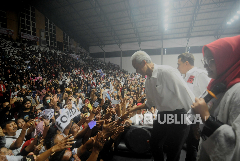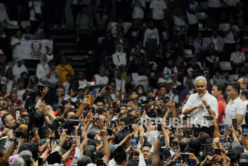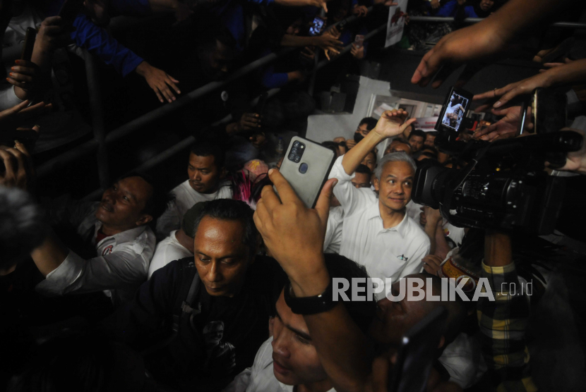 Bakal Calon Presiden dari PDI Perjuangan Ganjar Pranowo menyapa Relawan Jokowi saat Halal Bihalal di Jakarta, Sabtu (13/5/2023). Ganjar Pranowo menghadiri acara Halal Bihalal yang dihadiri 245 organisasi Relawan Jokowi yang nantinya bertranformasi mendukung Ganjar pada Pilpres 2024. (FOTO : Republika/Putra M. Akbar)