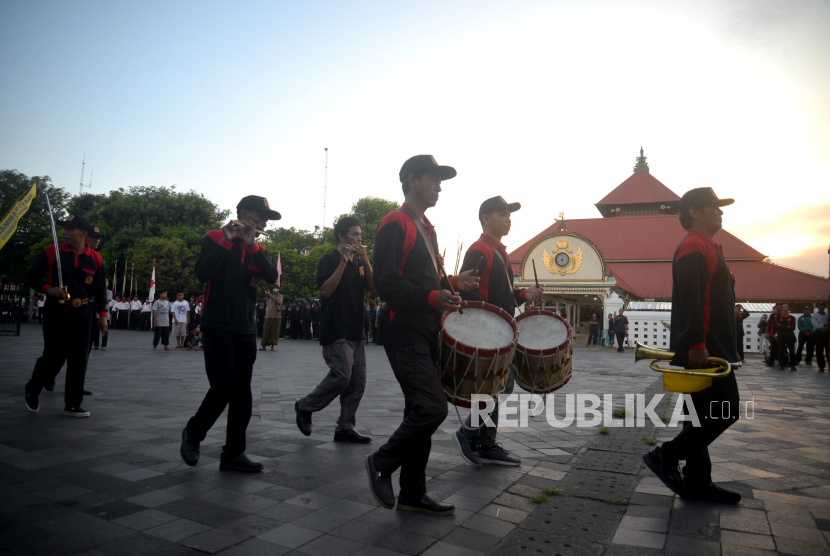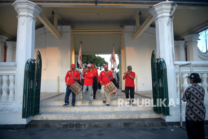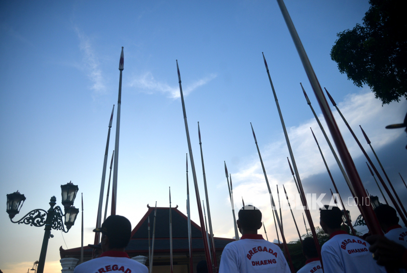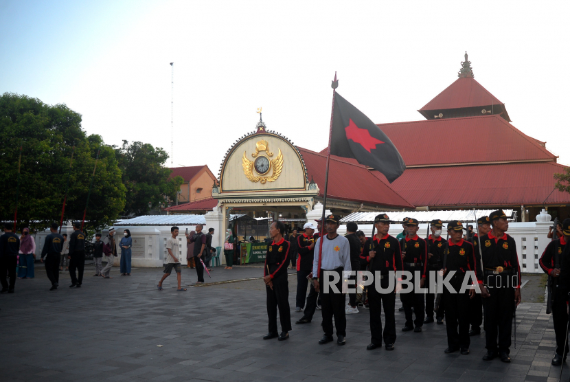 LalangBuana, YOGYAKARTA — Bregada Prajurit Keraton Yogyakarta melakukan gladi bersih Grebeg Syawal di depan Masjid Gedhe Kauman, Yogyakarta, Rabu (19/4/2023).