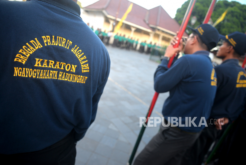 Bregada Prajurit Keraton Yogyakarta melakukan gladi bersih Grebeg Syawal di depan Masjid Gedhe Kauman, Yogyakarta, Rabu (19/4/2023). (FOTO : Republika/Wihdan Hidayat)