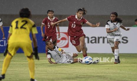 Pesepak bola Timnas Wanita Indonesia U-19 Claudia Alexandra Scheunemann (kedua kanan) berebut bola dengan pesepak bola Timor Leste Virginia Fatima Da Silva Branco (kiri bawah) pada pertandingan penyisihan grup A AFF U-19 Women Championship 2023 di Stadion Gelora Sriwijaya Jakabaring (GSJ) Palembang, Sumatera Selatan, Rabu (5/7/2023). Indonesia menang dengan skor 7-0. (FOTO : ANTARA FOTO/Nova Wahyudi)