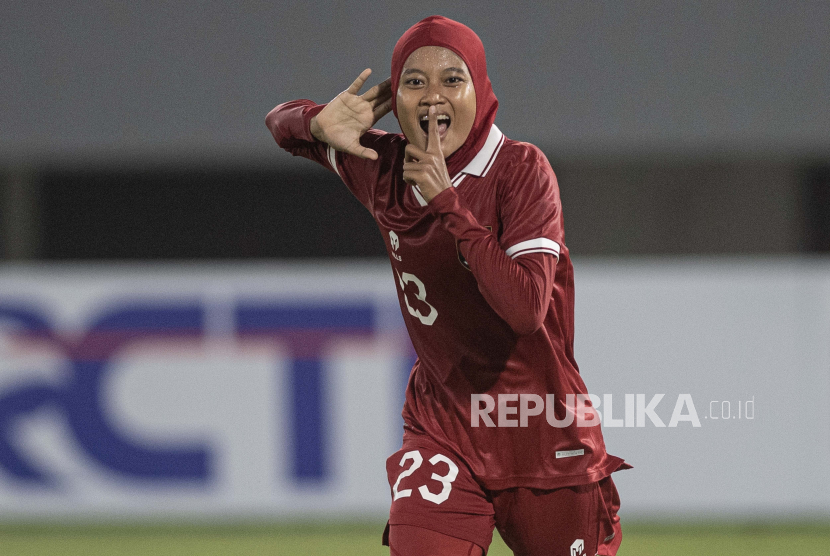 LalangBuana, PALEMBANG — Pesepak bola Timnas Wanita Indonesia U-19 Ayunda Dwi Anggraini meluapkan kegembiraannya usai mencetak gol ke gawang Timor Leste pada pertandingan penyisihan grup A AFF U-19 Women Championship 2023 di Stadion Gelora Sriwijaya Jakabaring (GSJ) Palembang, Sumatera Selatan, Rabu (5/7/2023). Indonesia menang dengan skor 7-0.