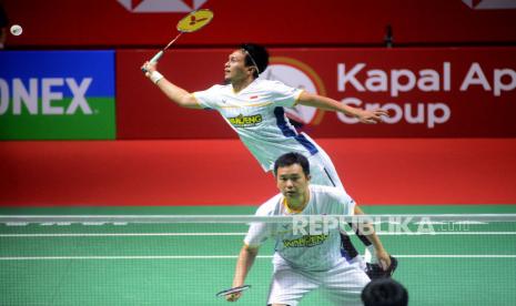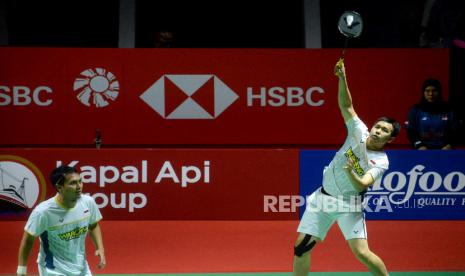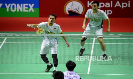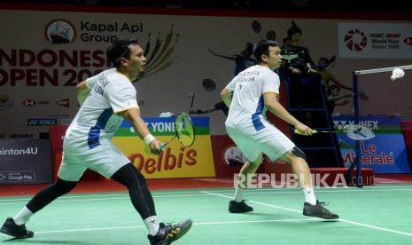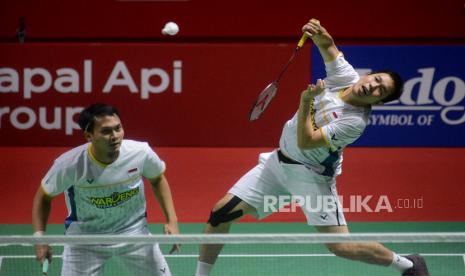 LalangBuana,  JAKARTA  —  Pebulu tangkis ganda putra Indonesia Mohammad Ahsan dan Hendra Setiawan memukul kok ke arah lawannya asal Thailand Supak Jomkoh dan Kittinupong Kedren dalam babak 32 besar Kapal Api Group Indonesia Open 2023 di Istora Senayan, Jakarta, Rabu (14/6/2023).