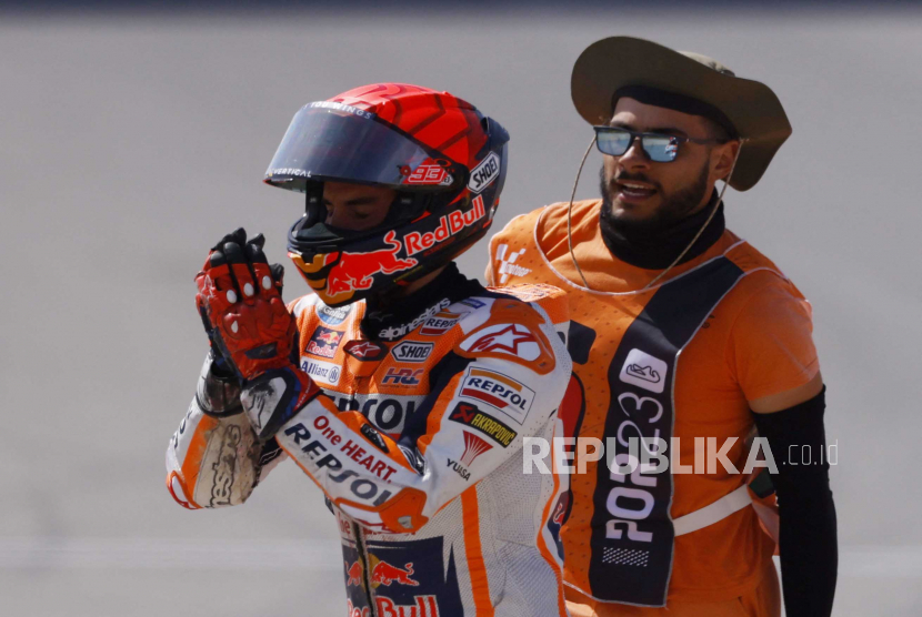 Pembalap tim Repsol Honda Marc Marquez memento maaf setelah terjatuh saat balapan di Grand Prix Sepeda Motor Portugal di trek balap Algarve International, Portimao, Portugal, Ahad, (26/3/2023).
