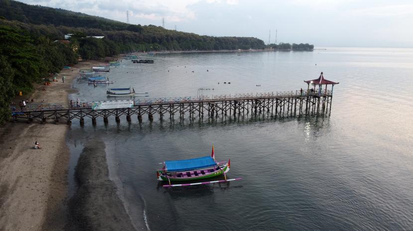 Foto udara suasana Pantai Pasir Putih di Situbondo, Jawa Timur. umlah pengunjung Wisata Bahari Pasir Putih Situbondo, Jawa Timur, pada tahun ini (2023) diperkirakan menurun. (ilustrasi)