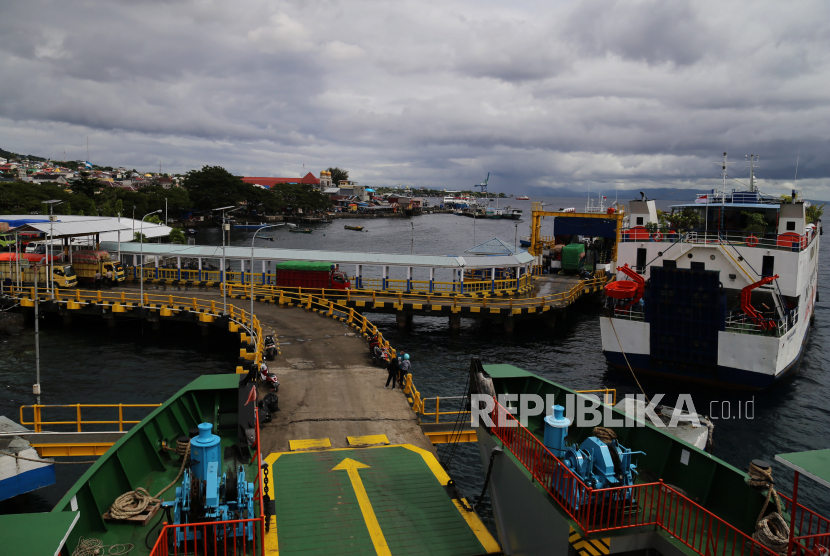 Sejumlah mobil truk bersiap menaiki kapal ferry di Pelabuhan Ferry Bastiong, Kota Ternate, Maluku Utara, Minggu (18/12/2022). Menjelang Hari Natal dan libur Tahun Baru 2023, PT Angkutan Sungai, Danau dan Penyeberangan (ASDP) Ferry Cabang Ternate menyiapkan 12 unit kapal ferry yang melayani penyeberangan tujuan Pelabuhan Ferry Morotai dan Pelabuhan Ferry Bitung Sulawesi Utara.