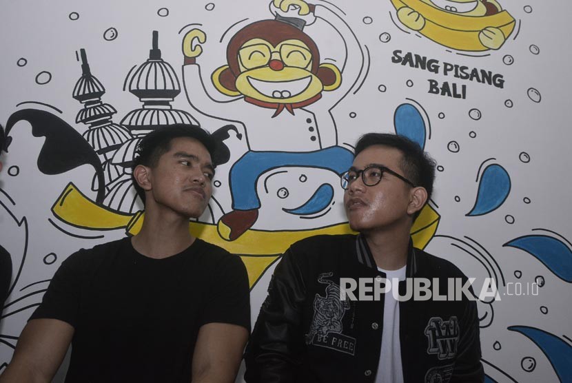 Putra Presiden Joko Widodo, Kaesang Pangarep (kiri) berbincang dengan kakaknya, Wali Kota Surakarta Gibran Rakabuming Raka.