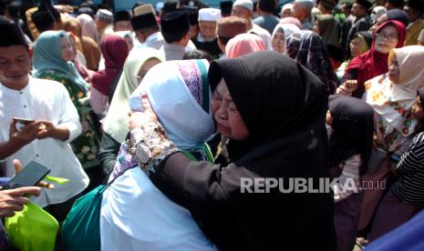 Anggota keluarga menangis sambil memeluk seorang haji setibanya di Kantor Pemerintah Kabupaten Tegal, Jawa Tengah, Senin (17/7/2023). Menurut Kanwil Kementerian Agama Kabupaten Tegal dua jamaah haji meninggal dunia di Mekah dari sebanyak 952 jamaah haji Kabupaten Tegal. (FOTO : ANTARA FOTO/Oky Lukmansyah)