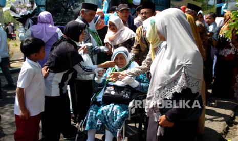 LalangBuana,  TEGAL  —  Seorang haji dengan kursi roda disambut sanak keluarganya setibanya di Kantor Pemerintah Kabupaten Tegal, Jawa Tengah, Senin (17/7/2023).