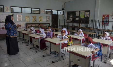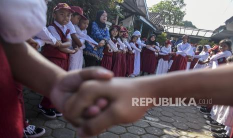 Sejumlah siswa baru mengikuti masa pengenalan lingkungan sekolah (MPLS) di SDN 010 Cidadap, Cidadap, Kota Bandung, Jawa Barat, Senin (17/7/2023). Pada hari pertama masuk sekolah, siswa menjalani masa pengenalan lingkungan sekolah (MPLS) yang diisi dengan perkenalan antara siswa, guru dan lingkungan sekolah. Sekolah tersebut merupakan salah satu sekolah yang kekurangan siswa, dengan jumlah siswa baru sebanyak 15 siswa dari target kuota sebanyak 28 siswa. (FOTO : ABDAN SYAKURA/REPUBLIKA)