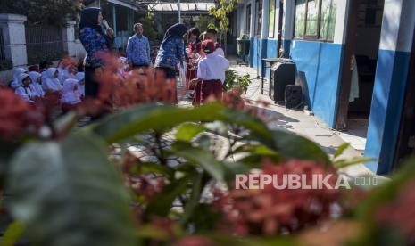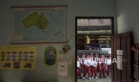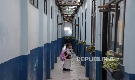 Siswa berjalan di depan ruang kelas SDN 010 Cidadap, Cidadap, Kota Bandung, Jawa Barat, Senin (17/7/2023). Pada hari pertama masuk sekolah, siswa menjalani masa pengenalan lingkungan sekolah (MPLS) yang diisi dengan perkenalan antara siswa, guru dan lingkungan sekolah. Sekolah tersebut merupakan salah satu sekolah yang kekurangan siswa, dengan jumlah siswa baru sebanyak 15 siswa dari target kuota sebanyak 28 siswa. (FOTO : ABDAN SYAKURA/REPUBLIKA)