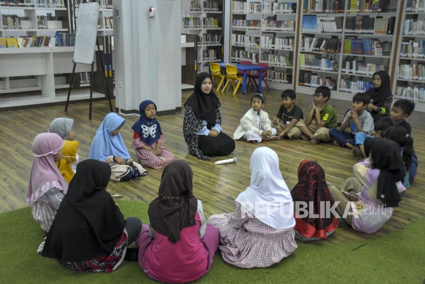 Relawan memberikan materi fikih untuk anak saat Pesantren Kilat Ngabuburit Ceria di Perpustakaan Masjid Pusdai, Kota Bandung, Jawa Barat, Sabtu (1/4/2023). Kegiatan tersebut untuk mengisi waktu bagi anak-anak jelang berbuka puasa dengan kegiatan membaca buku islami, mengaji, dakwah islam, permainan hingga sholat berjamaah. (FOTO : ABDAN SYAKURA/REPUBLIKA)