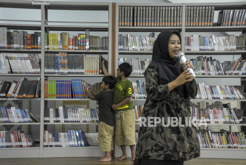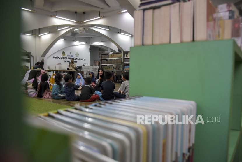 Relawan bersama peserta membaca buku saat Pesantren Kilat Ngabuburit Ceria di Perpustakaan Masjid Pusdai, Kota Bandung, Jawa Barat, Sabtu (1/4/2023). Kegiatan tersebut untuk mengisi waktu bagi anak-anak jelang berbuka puasa dengan kegiatan membaca buku islami, mengaji, dakwah islam, permainan hingga sholat berjamaah. (FOTO : ABDAN SYAKURA/REPUBLIKA)