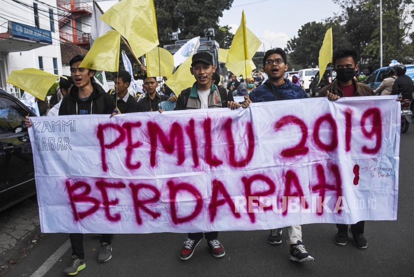 Sejumlah massa yang tergabung dalam Kesatuan Aksi Mahasiswa Muslim Indonesia (KAMMI) Jawa Barat melakukan aksi kemanusiaan Duka Korban Pemilu 2019 di depan Kantor KPU Provinsi Jawa Barat, Kota Bandung. Di Pemilu 2019, sebanyak 894 petugas KPPS meninggal dunia karena kelelahan dan sakit.