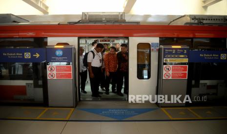Penumpang berada di gerbong LRT Jabodebek , Jakarta, Rabu (12/7/2023). LRT Jabodebek mulai melakukan diuji coba secara terbatas pada hari ini yaitu 12 Juli hingga 15 Agustus. Uji coba secara terbatas ini akan dilakukan secara bertahap. Tahap pertama 12 Juli sampai 26 Juli yang mengikuti uji coba adalah undangan terbatas dari kementerian/lembaga, jurnalis/media, dan komunitas. Tahap kedua mulai 27 Juli 2023 sampai 15 Agustus 2023 adalah untuk masyarakat umum yang sudah mengisi link pendaftaran. Uji coba ini bagian dari serangkaian pengujian kesiapan sarana, prasarana, dan sumber daya manusia sebelum sistem angkutan umum perkotaan berbasis rel itu diresmikan Presiden Joko Widodo pada 18 Agustus 2023. (FOTO : Republika/Prayogi)