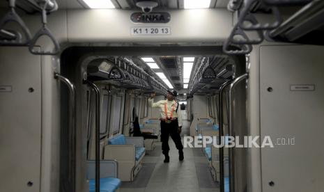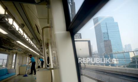 Petugas kebersihan berada di gerbong LRT Jabodebek, Jakarta, Rabu (12/7/2023). LRT Jabodebek mulai melakukan diuji coba secara terbatas pada hari ini yaitu 12 Juli hingga 15 Agustus. Uji coba secara terbatas ini akan dilakukan secara bertahap. Tahap pertama 12 Juli sampai 26 Juli yang mengikuti uji coba adalah undangan terbatas dari kementerian/lembaga, jurnalis/media, dan komunitas. Tahap kedua mulai 27 Juli 2023 sampai 15 Agustus 2023 adalah untuk masyarakat umum yang sudah mengisi link pendaftaran. Uji coba ini bagian dari serangkaian pengujian kesiapan sarana, prasarana, dan sumber daya manusia sebelum sistem angkutan umum perkotaan berbasis rel itu diresmikan Presiden Joko Widodo pada 18 Agustus 2023. (FOTO : Republika/Prayogi)