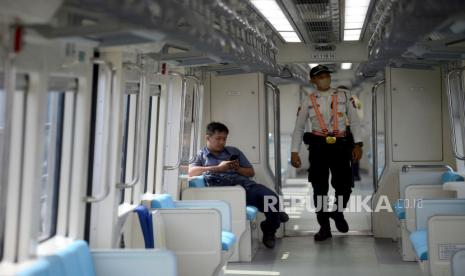 Petugas keamanan berada di gerbong LRT Jabodebek, Jakarta, Rabu (12/7/2023). LRT Jabodebek mulai melakukan diuji coba secara terbatas pada hari ini yaitu 12 Juli hingga 15 Agustus. Uji coba secara terbatas ini akan dilakukan secara bertahap. Tahap pertama 12 Juli sampai 26 Juli yang mengikuti uji coba adalah undangan terbatas dari kementerian/lembaga, jurnalis/media, dan komunitas. Tahap kedua mulai 27 Juli 2023 sampai 15 Agustus 2023 adalah untuk masyarakat umum yang sudah mengisi link pendaftaran. Uji coba ini bagian dari serangkaian pengujian kesiapan sarana, prasarana, dan sumber daya manusia sebelum sistem angkutan umum perkotaan berbasis rel itu diresmikan Presiden Joko Widodo pada 18 Agustus 2023. (FOTO : Republika/Prayogi)