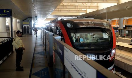 Petugas keamanan berjaga saat Rrangkaian gerbong LRT Jabodebek memasuki stasiun Cawang, Jakarta, Rabu (12/7/2023). LRT Jabodebek mulai melakukan diuji coba secara terbatas pada hari ini yaitu 12 Juli hingga 15 Agustus. Uji coba secara terbatas ini akan dilakukan secara bertahap. Tahap pertama 12 Juli sampai 26 Juli yang mengikuti uji coba adalah undangan terbatas dari kementerian/lembaga, jurnalis/media, dan komunitas. Tahap kedua mulai 27 Juli 2023 sampai 15 Agustus 2023 adalah untuk masyarakat umum yang sudah mengisi link pendaftaran. Uji coba ini bagian dari serangkaian pengujian kesiapan sarana, prasarana, dan sumber daya manusia sebelum sistem angkutan umum perkotaan berbasis rel itu diresmikan Presiden Joko Widodo pada 18 Agustus 2023. (FOTO : Republika/Prayogi)