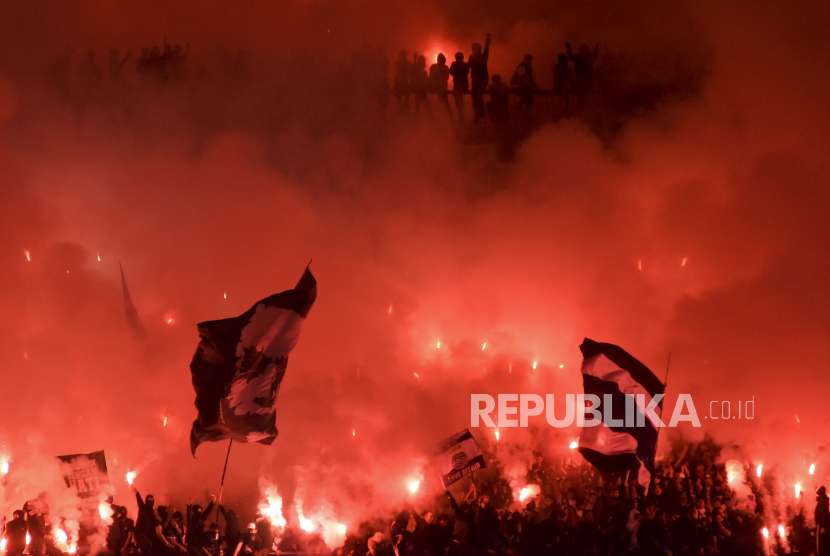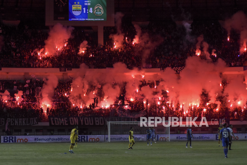 Suporter Persib Bandung menyalakan cerawat usai pertandingan lanjutan BRI Liga 1 di Stadion Gelora Bandung Lautan Api (GBLA), Gedebage, Kota Bandung, Jawa Barat, Sabtu (15/4/2023). Dalam pertandingan tersebut Persib Bandung kalah dari Persikabo 1973 dengan skor 4-1. (FOTO : ABDAN SYAKURA/REPUBLIKA)