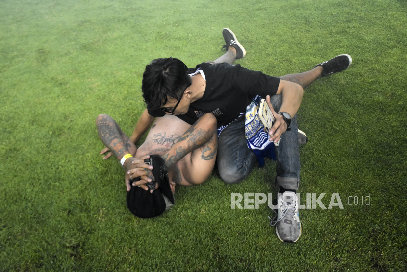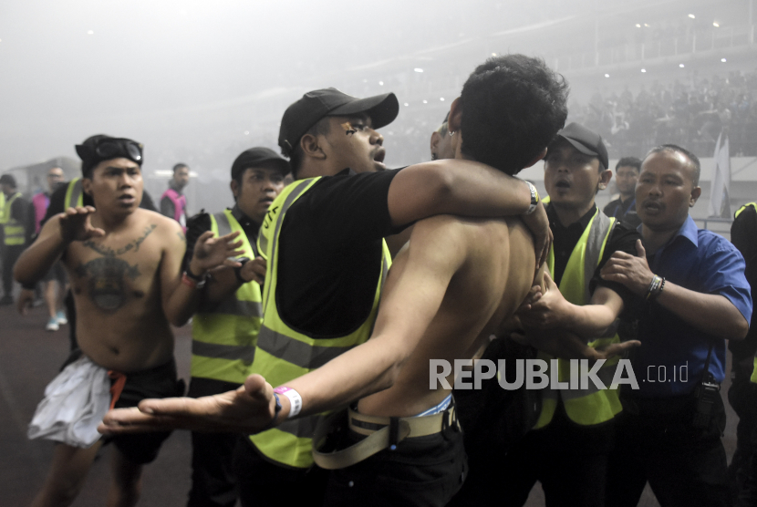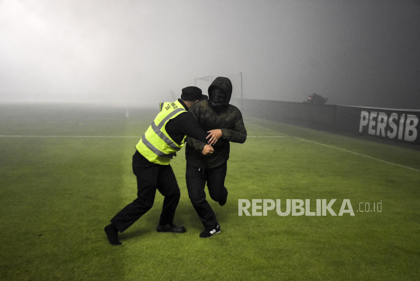 Petugas keamanan mengamankan suporter Persib Bandung yang memasuki lapangan usai pertandingan lanjutan BRI Liga 1 di Stadion Gelora Bandung Lautan Api (GBLA), Gedebage, Kota Bandung, Jawa Barat, Sabtu (15/4/2023). Dalam pertandingan tersebut Persib Bandung kalah dari Persikabo 1973 dengan skor 4-1. (FOTO : ABDAN SYAKURA/REPUBLIKA)