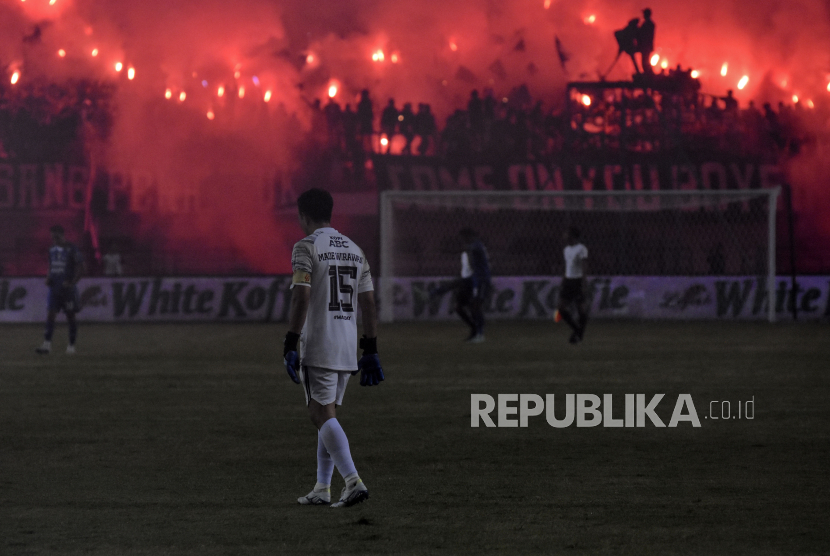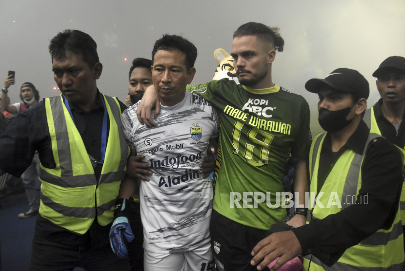 Penjaga gawang Persib Bandung I Made Wirawan (kedua kiri) dengan kawalan petugas keamanan berjalan keluar lapangan usai pertandingan lanjutan BRI Liga 1 di Stadion Gelora Bandung Lautan Api (GBLA), Gedebage, Kota Bandung, Jawa Barat, Sabtu (15/4/2023). Dalam pertandingan tersebut Persib Bandung kalah dari Persikabo 1973 dengan skor 4-1. (FOTO : ABDAN SYAKURA/REPUBLIKA)