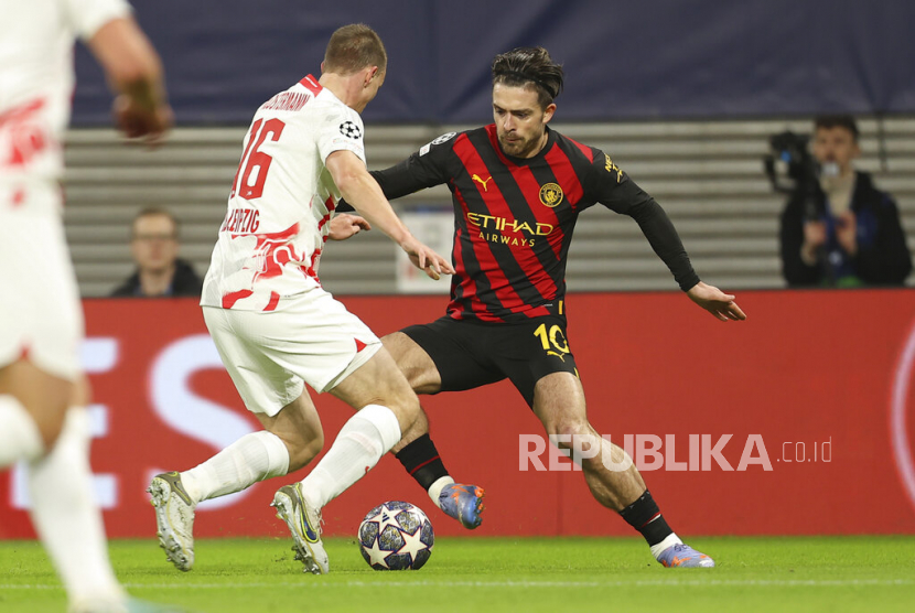 Pemain Manchester City, Jack Grealish (kanan) mengolah bola dibayangi pemain Leipzig Lukas Klostermann pada pertandingan sepak bola leg pertama babak enam belas Liga Champions UEFA antara RB Leipzig dan Manchester City di Leipzig, Jerman, Kamis (23/2/2023) dini hari WIB. (FOTO : AP Photo/Andreas Gora)