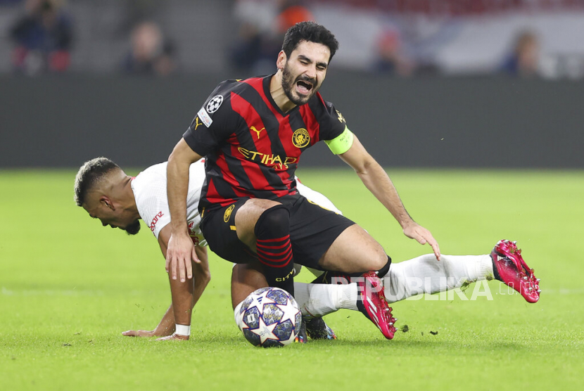 Pemain Leipzig Benjamin Henrichs (kiri) berebut bola dengan pemain Manchester City Ilkay Gundogan pada pertandingan sepak bola leg pertama babak enam belas Liga Champions UEFA antara RB Leipzig dan Manchester City di Leipzig, Jerman, Kamis (23/2/2023) dini hari WIB. (FOTO : AP Photo/Andreas Gora)