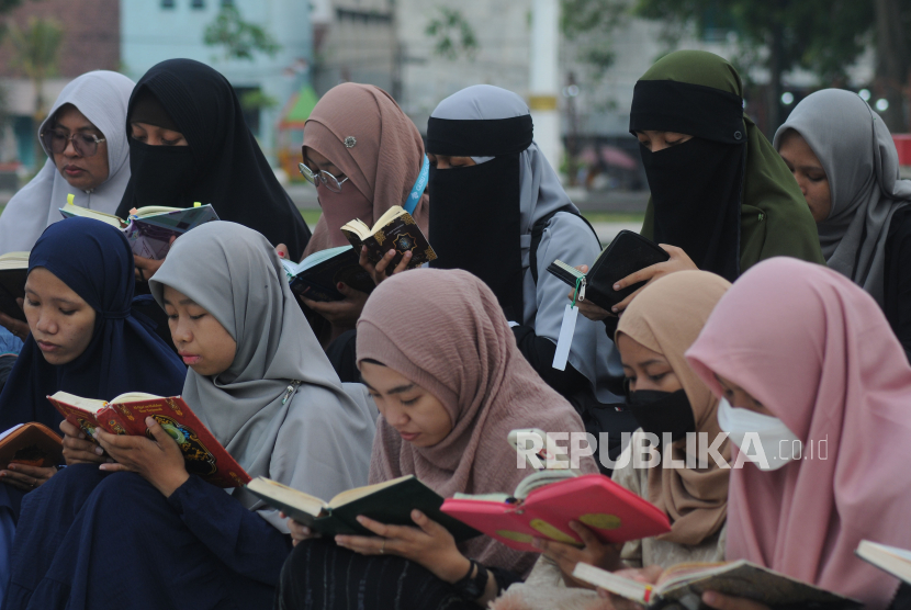 LalangBuana, KLATEN — Peserta mengikuti mengaji bersama saat ngabuburit di Alun-alun Klaten, Jawa Tengah, Kamis (23/3/2023).