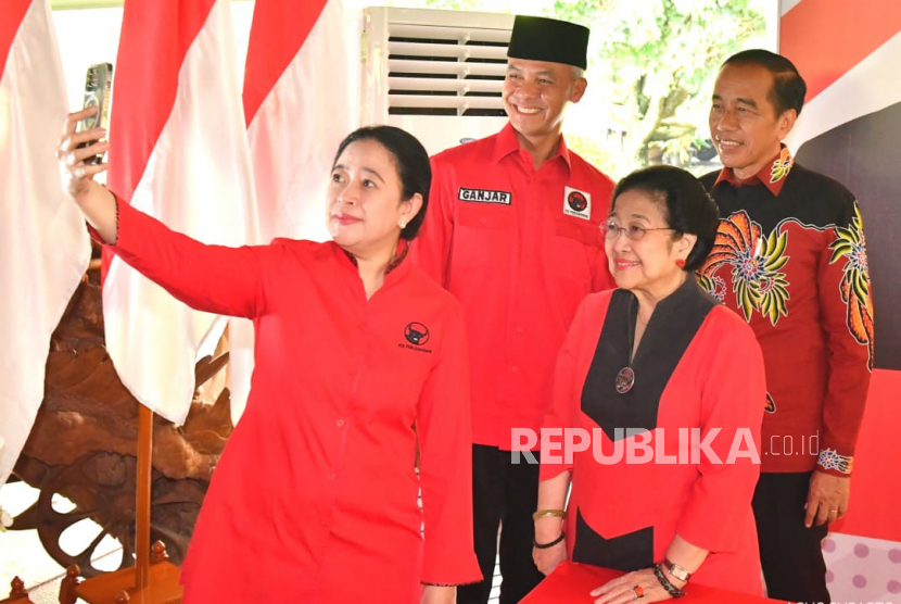 LalangBuana, BOGOR — Ketua Umum PDIP Megawati Soekarnoputri bersama Presiden Joko Widodo, Ketua DPR Puan Maharani, Ganjar Pranowo dan Prananda Prabowo berfoto bersama saat deklarasi Calon Presiden dari PDIP di Istana Batu Tulis, Bogor, Jawa Barat, Jumat (21/4/2023).