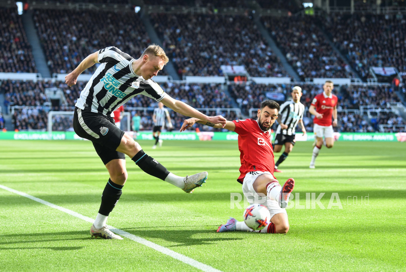 Sean Longstaff of Newcastle United FC (kiri) dan Bruno Fernandes of Manchester United FC (kanan) beraksi pada pertandingan sepak bola Liga Premier Inggris antara Newcastle United dan Manchester United di Newcastle, Inggris, (02/04/2023). (FOTO : EPA-EFE/Peter Powell )