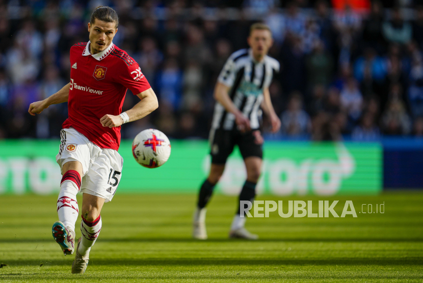 Marcel Sabitzer dari Manchester United (kiri), mengontrol bola pada pertandingan sepak bola Liga Premier Inggris antara Newcastle United dan Manchester United, di stadion St. James Park di Newcastle, Inggris, Ahad (02/04/2023). (FOTO : AP Photo/Jon Super)