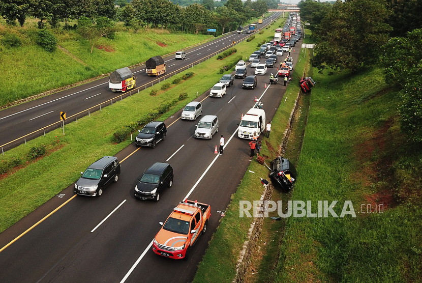 Kemacetan terjadi akibat dua kendaraan mengalami kecelakaan lalu lintas di ruas tol Cipali Km 74 arah Palimanan, Jawa Barat, Selasa (18/4/2023). Satu kendaraan minibus yang mengangkut lima orang pemudik tujuan Ngawi, Jawa Timur itu terlibat kecelakaan dengan mobil truk pengangkut barang. Kecelakaan diduga akibat supir truk mengantuk sehingga lepas kendali dan menabrak mobil minibus. Tidak ada korban jiwa dalam kecelakaan tersebut, namun akibat kecelakaan itu sempat terjadi kemacetan hingga 2 kilometer.