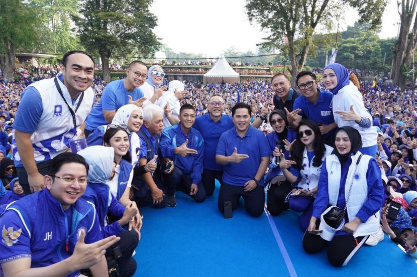Menteri Badan Usaha Milik Negara (BUMN) Erick Thohir bersama Ketua Umum PAN Zulkifli serta mantan Ketua Umum PAN Hatta Rajasa ikut menghadiri acara Senam Sehat Birukan Langit Indonesia yang diselenggarakan Partai Amanat Nasional (PAN) di Kota Bandung, Jawa Barat, Ahad (19/2/2023).