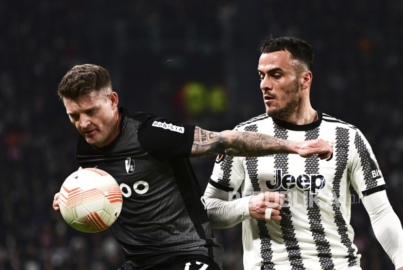Pemain Freiburg Lukas Kubler dan pemain Juventus Filip Kostic berebut bola pada pertandingan sepak bola Liga Europa antara Juventus dan Freiburg di Juventus Stadium, Turin, Italia, Jumat (10/3/2023) dini hari WIB.