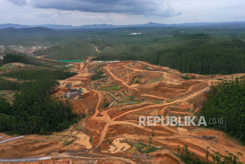 Foto udara suasana proyek pembangunan Rumah Tapak Jabatan Menteri di Kawasan Inti Pusat Pemerintahan Ibu Kota Negara, Sepaku, Kabupaten Penajam Paser Utara, Kalimantan Timur, Selasa (28/2//2023). (FOTO : ANTARA FOTO/Indrianto Eko Suwarso)