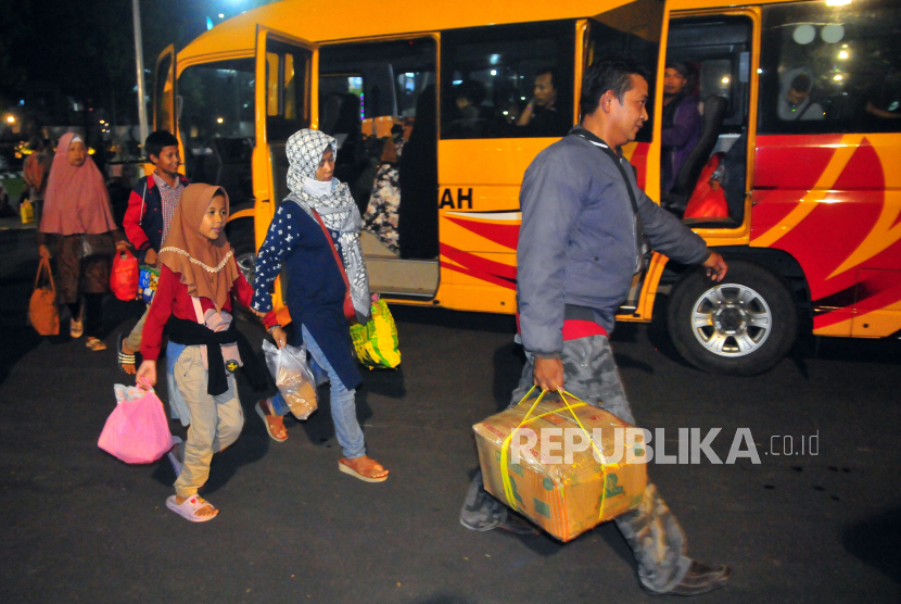 Sejumlah peserta Program Mudik Gratis Jateng berjalan saat tiba di Pendopo Kudus, Jawa Tengah, Senin (17/4/2023). Sebanyak 171 orang mengikuti program mudik gratis dari Jakarta yang difasilitasi Pemkab Kudus dengan Pemprov Jawa Tengah. (FOTO : ANTARA FOTO/Yusuf Nugroho)