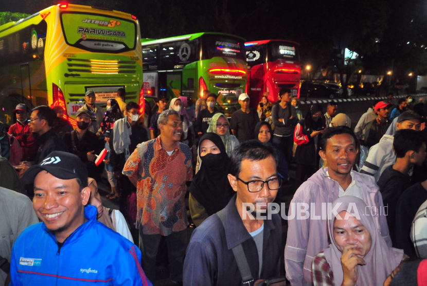 LalangBuana, KUDUS — Sejumlah peserta Program Mudik Gratis Jateng berdiri saat tiba di Pendopo Kudus, Jawa Tengah, Senin (17/4/2023). Sebanyak 171 orang mengikuti program mudik gratis dari Jakarta yang difasilitasi Pemkab Kudus dengan Pemprov Jawa Tengah.