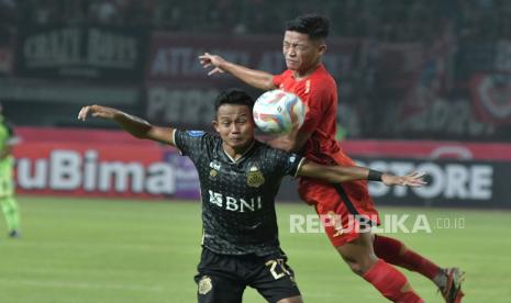 Pesepak bola Bhayangkara Presisi Indonesia Fc Sani Rizki (kiri) berebut bola dengan pesepak bola Persija Jakarta Rio Fahmi (kanan) pada lanjutan Liga 1 di Stadion Patriot Chandrabhaga, Bekasi, Jawa Barat, Ahad (16/7/2023). (FOTO : ANTARA FOTO/ Fakhri Hermansyah)